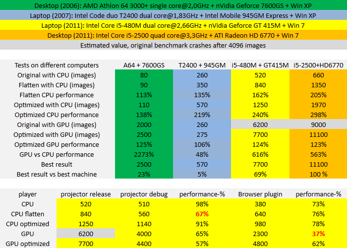 Second interesting issue is that GPU really does make a difference with Flash 11. When the five year old desktop computer with the slowest CPU starts using its GPU (which in fact is not that good) for the rendering it beats the laptop that has no GPU by a huge margin (2500 vs. 570 images) and even gets better results than the fastest computer with CPU rendering (2500 vs. 1970 images).